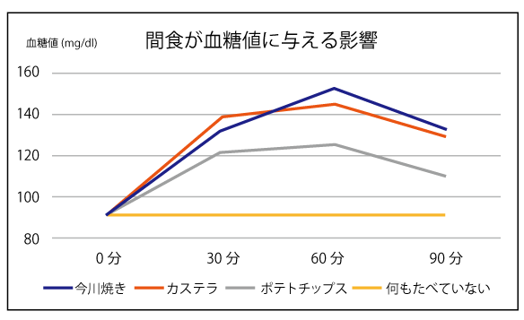 やはり、こういった物だと血糖が上がりますね。 ナッツや、カカオ70%以上のチョコレートは、 血糖値への影響は少ないですが、これらは油ですので、取り過ぎには要注意です。 やはり一番のおすすめは牛乳と果物ですね。1日分の果物の半分をおやつとしてとることがおすすめです。