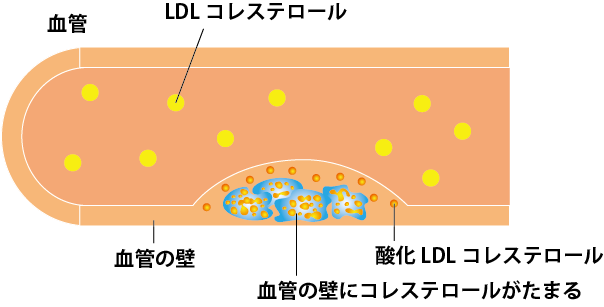 悪玉コレステロール(LDLコレステロール)が増えすぎると、血管の壁にコレステロールがたまって動脈硬化の原因になります。 高い状態を放置していると動脈硬化がすすんで血管が狭くなり狭心症や心筋梗塞、そして脳梗塞といった重大な病気につながります。